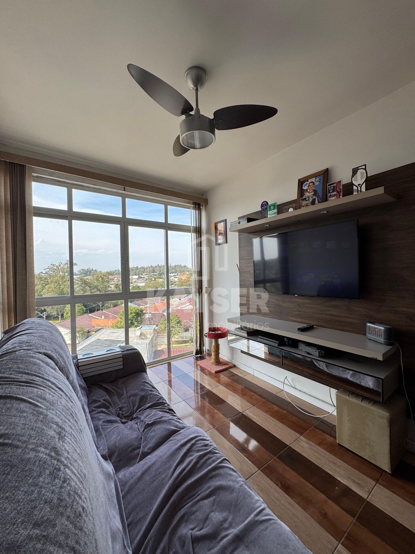 Sala de estar com painel para TV e ventilador de teto