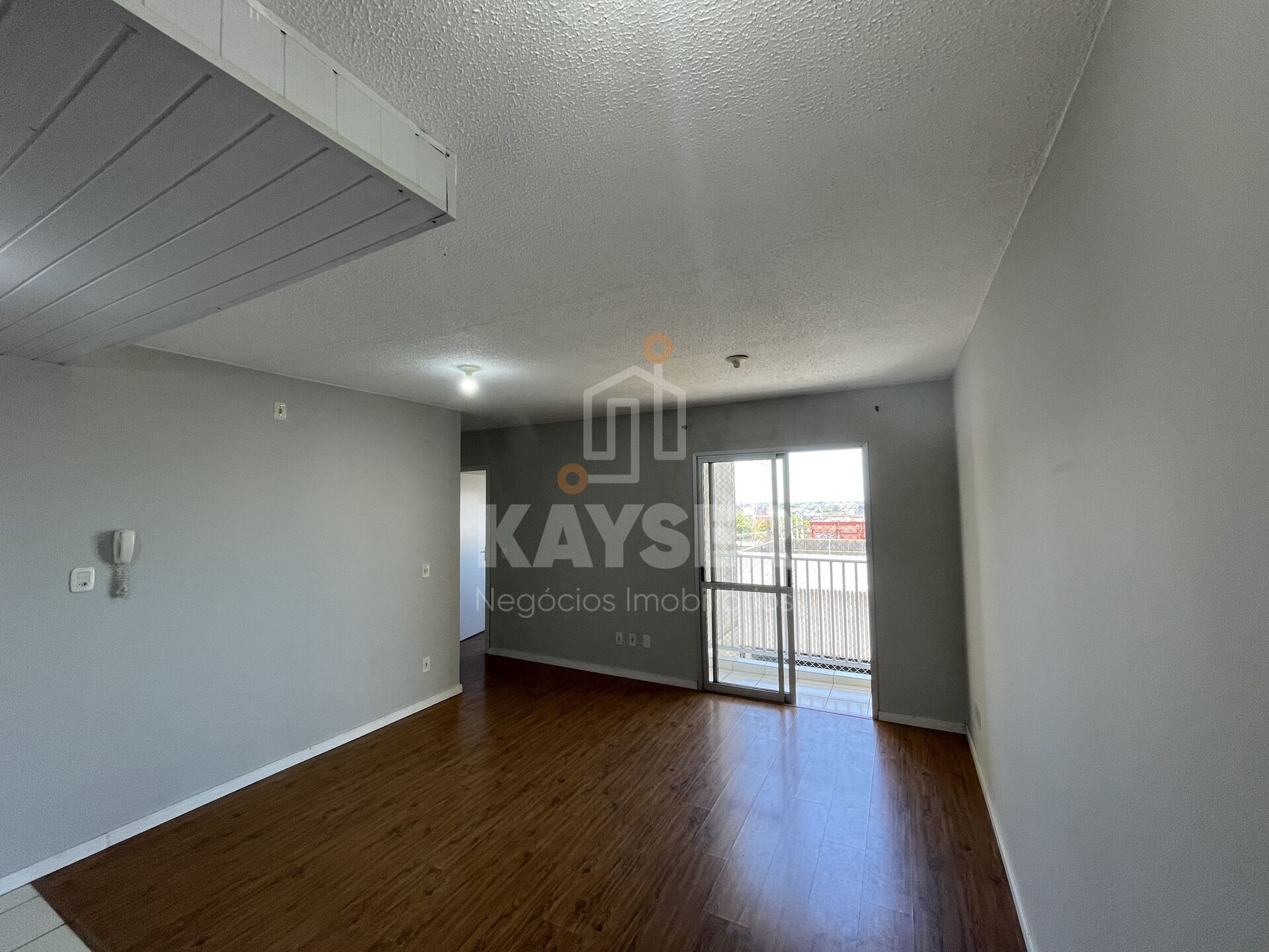 Apartamento de 2 quartos, sala, cozinha, banheiro, área de serviço e sacada.