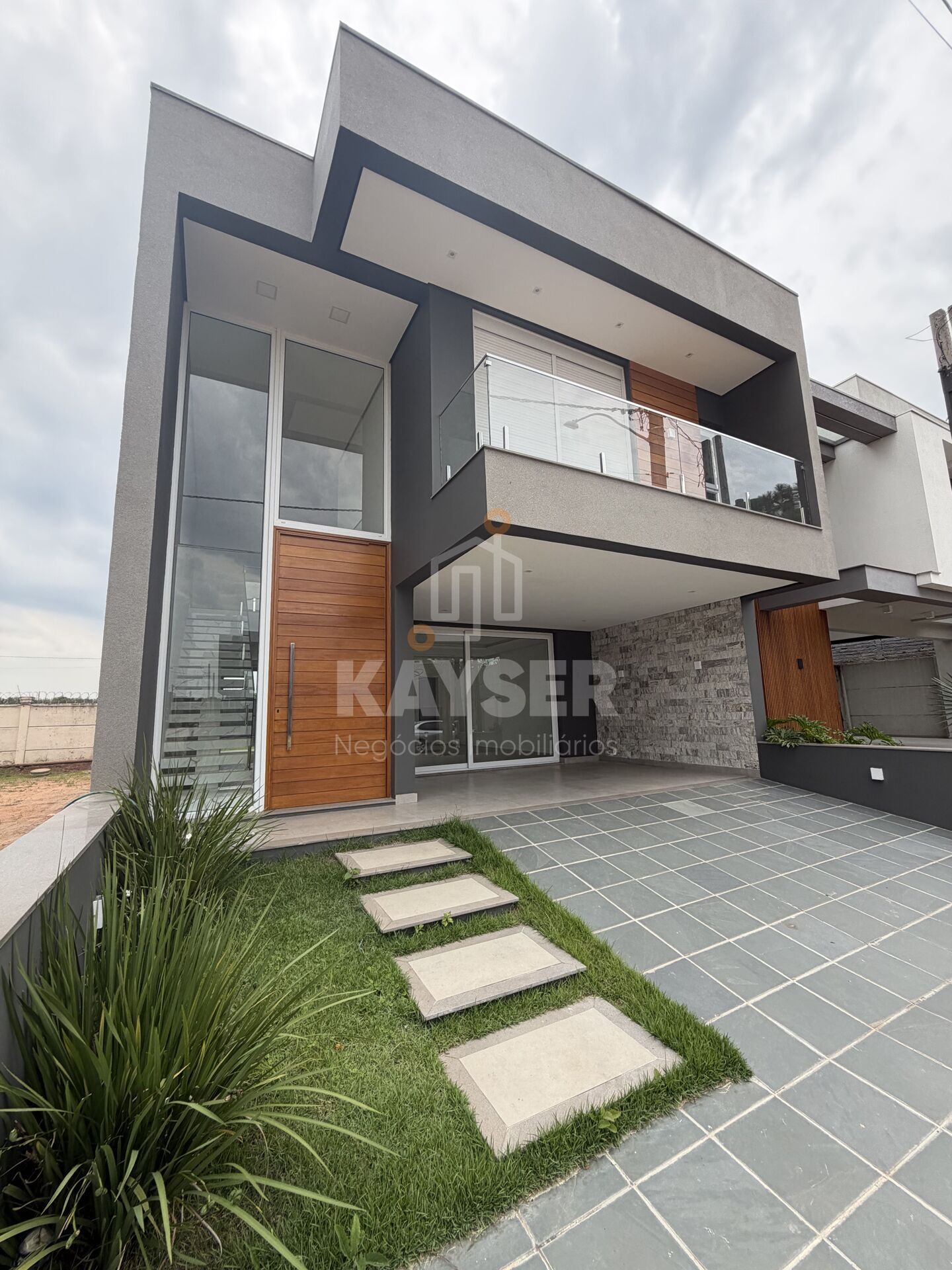 Possui sala de estar, jantar e cozinha integrados, com espera para ilha, lavabo, banheiro social, lavanderia no piso superior e jardim de inverno.
