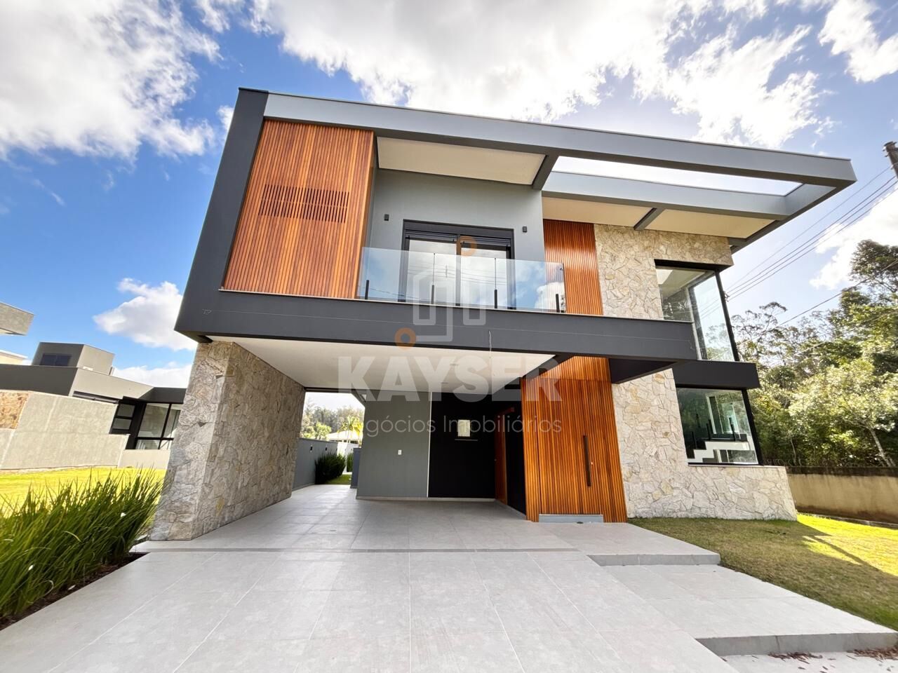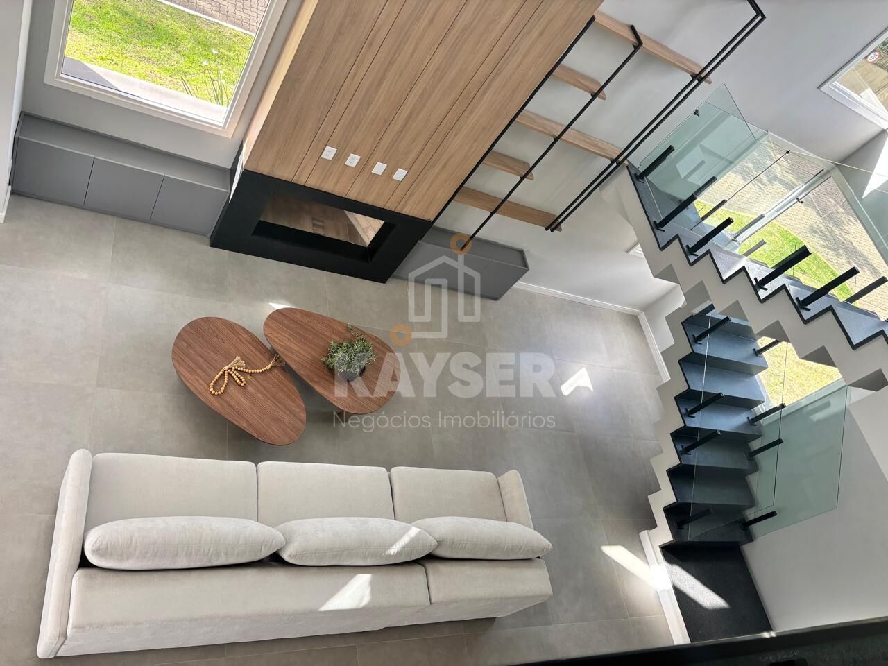 O sobrado se destaca por sua ótima posição solar, a casa também recebe muita iluminação natural, com pé direito duplo na sala de estar, lareira, lavabo, churrasqueira com espera para bifeira, aberturas em pvc, e piscina no pátio privativo.