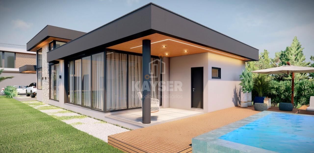 Casa térrea com pé direito alto e arquitetura moderna com 270 m² de área construída, com 4 dormitórios, sendo 3 suítes, home office. living integrado, lareira, espaço gourmet, piscina de concreto e 4 vagas de garagem, sendo 2 cobertas e pátio amplo.