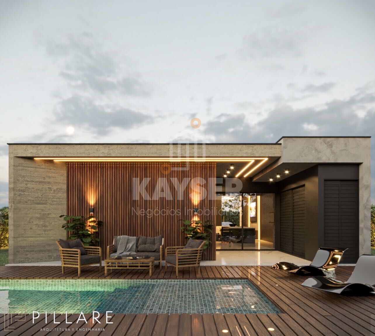 Casa térrea com designer moderno,144 m² construídos, com 4 suítes, living integrado, piscina com deck, vagas de garagem e fachada revestida com pedra natural e concreto aparente.