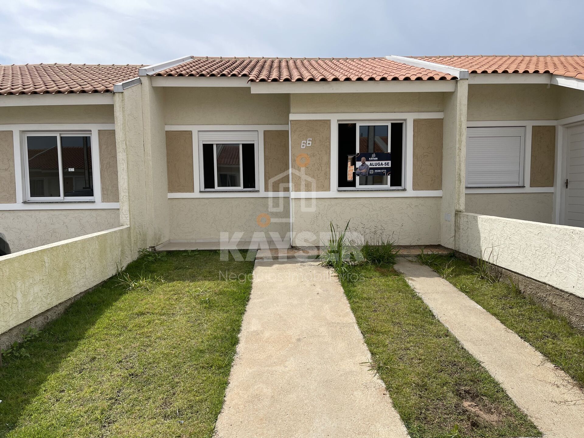 2 quartos, banheiro, sala e cozinha, pátio nos fundos, garagem para 2 carros.